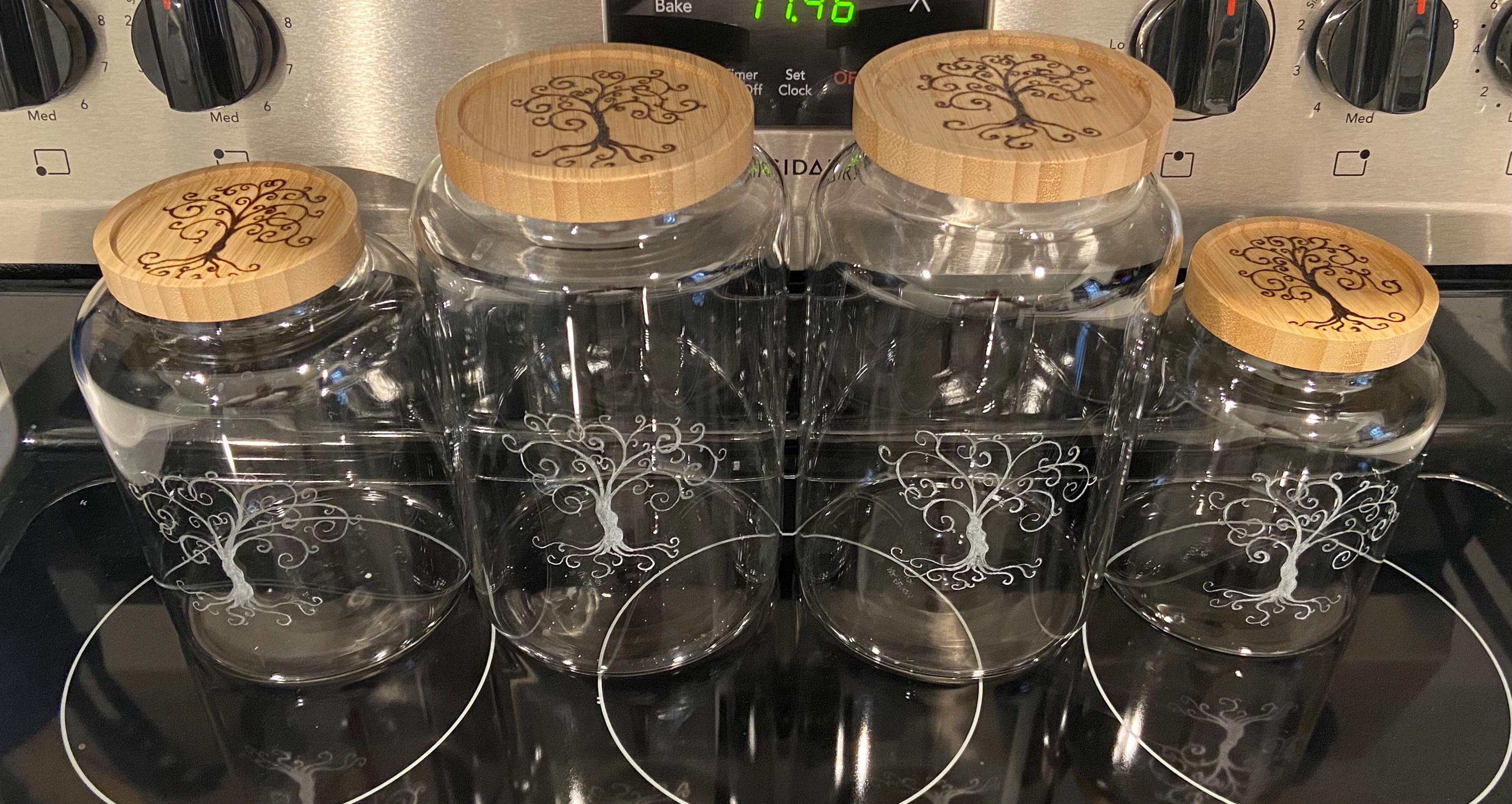 This is a set of four glass canisters with bamboo lids which has been hand etched and wood burned with my stylized tree of life design.